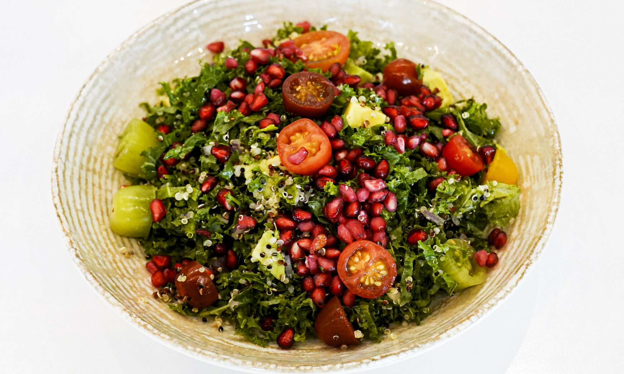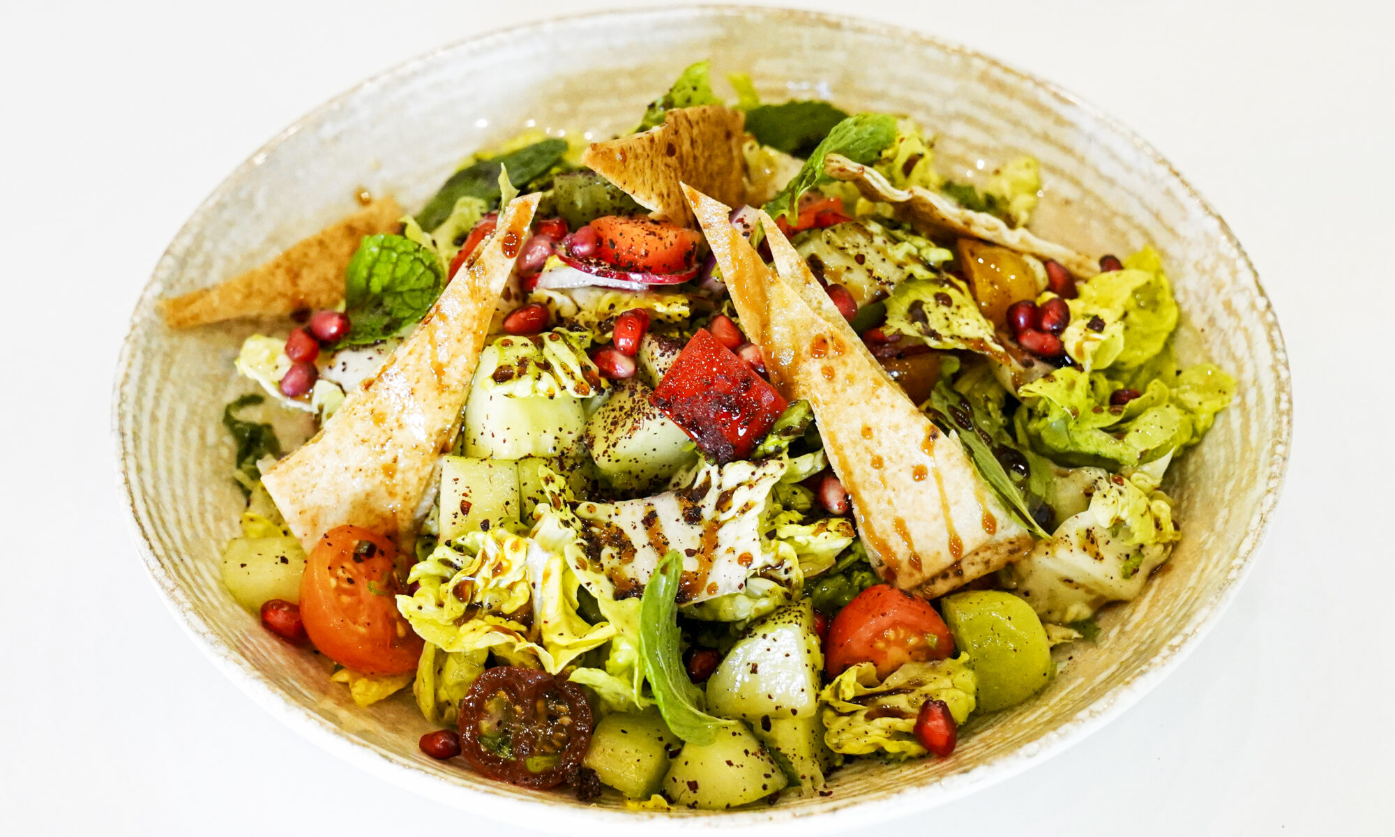 Mix lettuce, rocket, feta, toasted walnuts, pickle